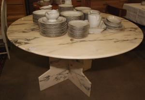 Det här matbordet ropas ut för 500 kr! Det är ju så schysst sånär som på foten. Går den att byta ut tro? För 500 kr kanske man kan leva med den, den skyms ju av stolar sedan. Diametern är 140 cm. (Björnssons i Lund 31 maj)