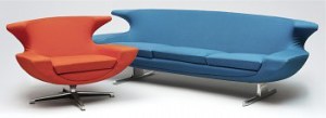 Här är en svensktillverkad soffa och fåtölj från 50-60 talet. Kul i formen men man brukar bli avskräck när man ser hur slitet tyget är. Utrop 15-20000 kr. (Uppsala Auktionskammare 6 juni).