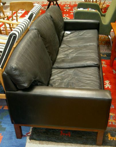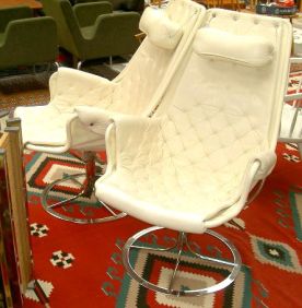 En svart skinnsoffa från 1960-talet eller Bruno Mathsons fåtöljer ”Jetson” i vit skinnklädsel skulle kanske kunna vara något för vardagsrummet?! (Hallands Auktionsverk 29 maj). /Slutbud 1400 kr resp 6000 kr/.