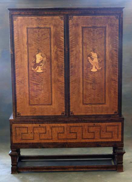 Till vänster är ett mycket stiligt serveringsskåp i alm/almrot. Skåpet är 125 cm högt. Utrop 10000 kr. /Slutbud: 11000 kr/