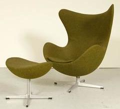 Fåtöljen som alla känner till finns på Lauritz.com just nu (auktionen avslutas 5 juni). Arne Jacobsen designade Ägget till SAS Hotell i Köpenhamn 1958. Han ritade även byggnaden och inredningen, allt från dörrhandtag och kranar till askkoppar och möbler. Ägget har blivit ganska dyrt på auktion och svart eller brunt skinn är mest efterfrågat. På Moderna kvalitén i april i år på Stockholms Auktionsverk gick en Ägget med svart skinnklädel för 24000 kr (utan pall och med visst slitage). På Bukowskis Moderna vid samma tid såldes tre Äggetfåtöjer i svart skinn; en med pall gick för 48000 kr och två utan pall gick för 48000 kr resp 27000 kr. Prisskillnaden beror iallafall delvis på skicket. En nytillverkad Äggetfåtölj, tygklädd utan pall, kostar ungefär 45000 kr. Man ska tänka på att äldre Äggetfåtöljer kan vara torra i skumgummistoppningen. Att åtgärda detta är inte billigt. Den här fåtöljen med pall är tygklädd (original) och från 1960-talet. Utropet är 35000 kr med ett minstabud på 24000 kr. Ingen har bjudit över 24000 kr än.