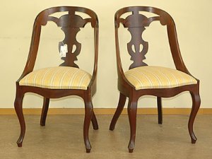 På Göteborgs Auktionsverk ropas dessa två göteborgsstolar i mahogny ut den 10 juni. De är ganska enkla i utförandet men kan också bli mycket dekorativa inslag i inredningen. Med en annan klädsel, typ enfärgad gräddvit, så skulle de bli ursnygga! Utropet är 1000 kr men nätbudet är uppe i 1600 kr.