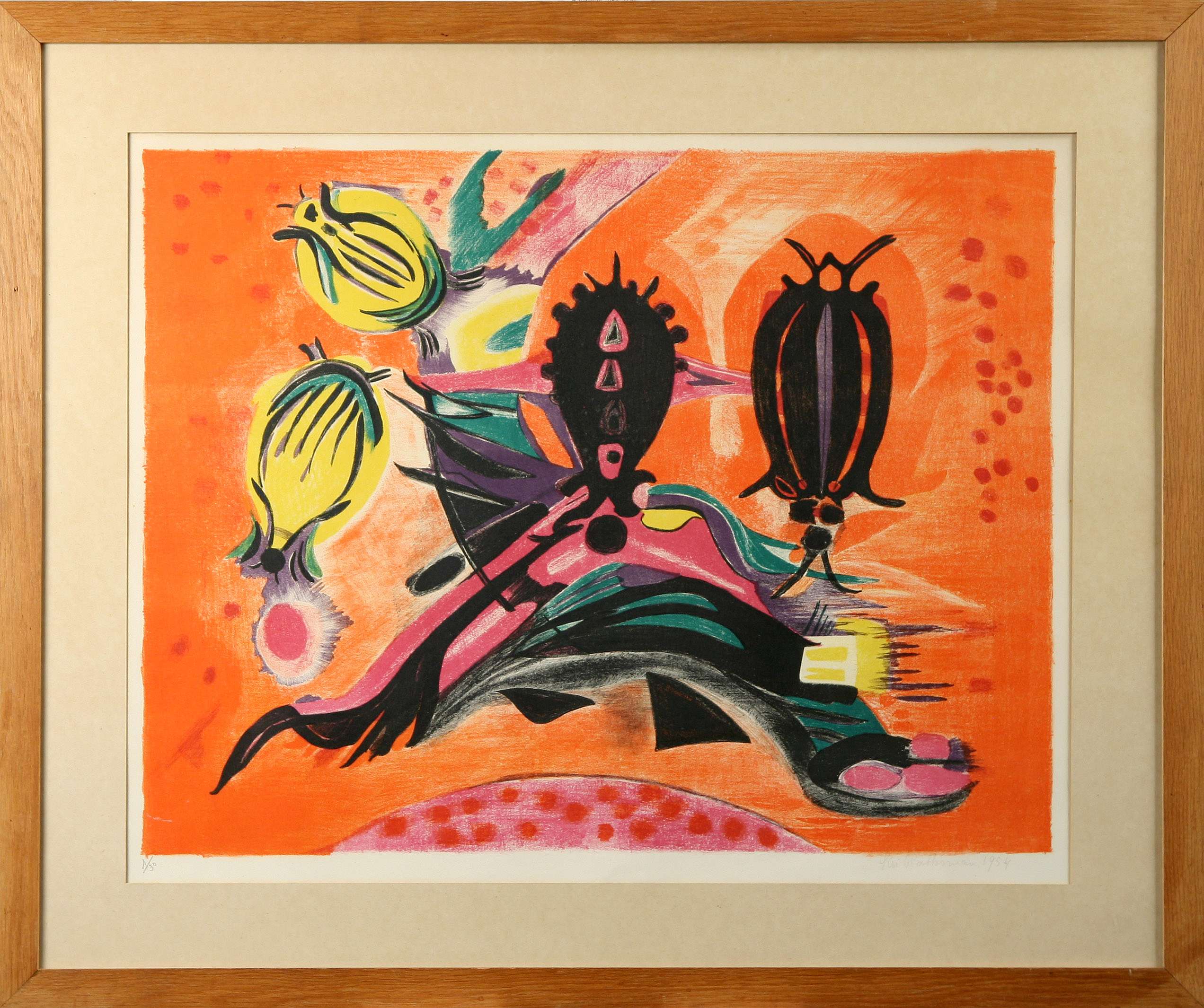 De här två tavlorna kan liva upp vilken vägg som helst. Den första är en färglitografi från 1954 av Siri Rathsman och den andra är en färglitografi från 1978 av den holländske konstnären Karel Appel. Båda har ett utropspris på 1500 kr. (Stockholms Auktionsverk 9-10 juni).