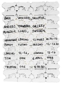 Ett vernissagekort av Dan Wolgers från 1988 ropas ut. Allt han gör blir konst! Tänk bara på telefonkatalogen. Jag sparade förresten en sådan. Smart va?! Vernissagekortet är 17x12cm och ropas ut för 5000-6000 kr. (Stockholms Auktionsverk 13 juni).