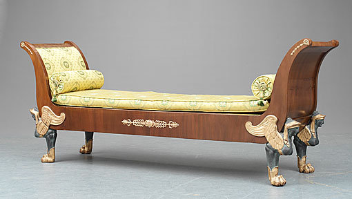Vilken schysst vilsoffa i svensk empire. Den är lång, 245 cm, och då får man betänka att den har varit ännu längre. Den är avkortad någongång och mittbenet har tagits bort. Den har visserligen en del defekter men ropas ut för 20-25 tkr. Har man stort och luftigt hemma kan den vara ett kul inslag i inredningen. (Lilla Bukowskis 16-17 juni).