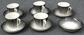 Delar ur ”Zebra”-servísen blir alltid dyra på auktion. Zebra formgavs på 1950-talet av Eugen Trost för Gefle Porslinsfabrik. Han är lite av en doldis i designvärlden. Han föddes och utbildade sig i Tyskland. Han flyttade till Sverige då han blev chefsdekoratör på Gefle Poslinsfabrik. Han stod lite i skuggan av deras konstnärlige ledare, Arthur Percy. Eugen Trosts 78 andra dekorer för porslinsfabriken är ganska anonyma och hade han inte gjort Zebra (och ett annat rödlila poslin med gulddekor som hette Rubin) så hade han nog varit tämligen okänd. I Zebraserien som tillverkades mellan 1955-67 finns kaffe-, te- och chokladkoppar med fat. Vidare finns assietter samt en tekanna. Här är det fem tekoppar med sju fat som ropas ut för 2000 kr. Högsta bud just nu är 1250 kr trots mindre skador. (Lauritz.com 17 juni)