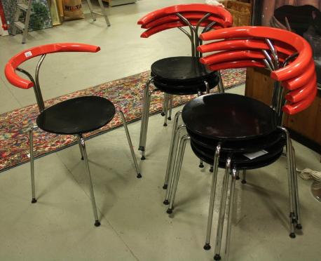 De här åtta stapelbara stolarna ropas ut för 1000 kr (125 kr/st). Jag vet inte riktigt vad jag tycker om dem. Jag skulle vilja se dem i verkligheten. Helst skulle jag vilja att att även ryggstödet var målat (rött) men det kan ju vara klarlackat trä också.Utropspriset är ju inte alltför högt och stolarna kan säkert vara roliga på rätt plats. (Sikö Auktioner 24-25 juni).