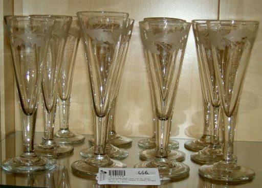 Champagneglas (12 st) i empire från 1800- talets första hälft med ingraverade eklöv (typiskt för empiren). Sådana skulle jag gärna ha på landet till fint! (Hallands Auktionsverk 26 juni).