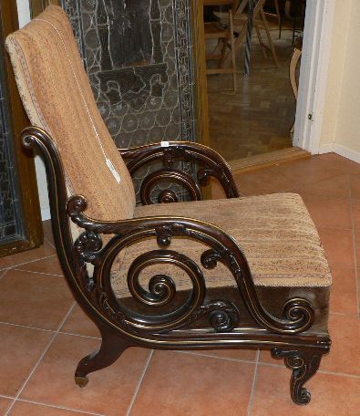 Den här fåtöljen är ganska cool faktisk. Med en annan klädsel så kan den bli väldigt bra. Den är från 1800-talets andra hälft och träslaget är palisander med inslag av mässingslister. (Hallands Auktionsverk 26 juni)