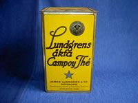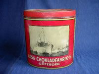 också. Här är ett axplock. Den röda lådan till vänstar är Mandarinpastiller från Stockholm (längd 42 cm). Den röda burken till höger är Atög Chokladfabrik från Göteborg (höjd 25 cm). Den gula burken är en teburk som är 36 cm hög.