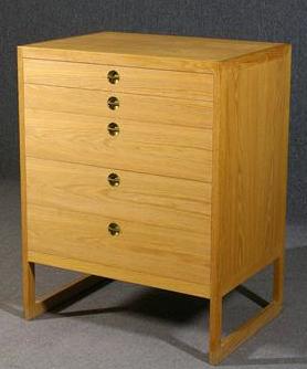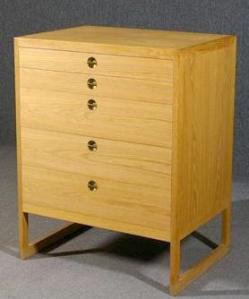 Formgivare här är Börge Mogensen (1914-72). Han var en av de stora danska designerna vid sidan av Arne Jacobsen, Hans Wegner m fl. Han inspirerades mycket av shaker-stilen och han var särskilt inne på att göra fuktionella förvaringsmöbler. Denna byråmodell heter ”BM 59” och är i ek. Höjden är 90 cm, bredden 70 cm och djupet 50 cm. Den ropas ut för 8000 kr och högsta bud just nu är 4600 kr (Lauritz.com 1 juli).