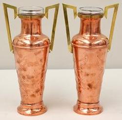 De här vaserna har en ganska schysst form. De är 32 cm höga. Jag vet inte vad jag tycker om att de är så nyputsade. Ibland kan gammal patina vara snyggast. Fast i det här fallet är det möjligt att de faktiskt ska vara blanka för att komma till sin rätt. De ropas ut för 1000 kr och högsta bud just nu är 600 kr. (Lauritz.com 10 juli).