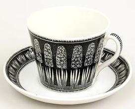 Den här tekoppen heter Hyacint och är designad av Arthur Percy för Gefle Porslinsfabrik. Svart dekor på vit botten. Jag har inte sett modellen förut. Snygg. Arthur Percy blev konstnärlig ledare på Gefle 1923 men jag kan tänka mig att dessa koppar kom någongång på 50-talet. Sex stycken ropas ut för 1000 kr och högsta bud just nu är 475 kr (Lauritz.com 16 juli).