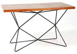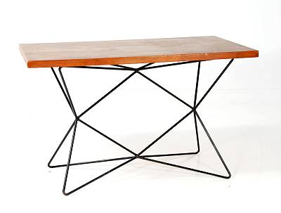 Trehöjdsbordet, formgivet av Bengt Gullberg i slutet av 1940-talet, är en utmärkt uppfinning om man har trångt hemma. Metallunderredet kan nämligen ställas på tre håll så att höjden blir 54, 72 respektive 120 cm. Man får alltså soffbord, matbord och barbord i ett! Bordsskivan som är av teak är 120×75 cm. Jag tycker bordet är fantastiskt snyggt och det ropas ut för 5000 kr (Stockholms Auktionsverk 11 aug).