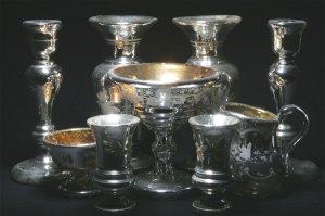 Fattigmanssilver dök upp i mitten av 1800-talet och var glas som blåstes tunnt och dubbelväggigt. Väggarnas insida belades med en kvicksilverlegering eller folierades med silver. Ofta målades de också med en vit dekor som föremålen på bilden. Detta var billigt i framställning och har därför fått namnet fattigmanssilver. Det kallades också kvicksilverglas.