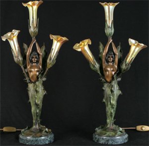 Det tar ett tag innan man förstår vad detta är men så ser man sladdarna och inser att det är någon form av belysning. Verkligen fantasifullt. Men jag gillar ju kitsch så jag kan inte låta bli att fascineras. De är i jugendstil och 56 cm höga. Lamporna ropas ut för 6-8000 kr (Uppsala Auktionsverk 18 aug).