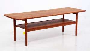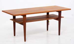 Två teakbord i dansk design från 60-talet bjuds ut på 1960-talet på Stockholms Auktionsverk den 25 augusti. Sådana bord brukar göra sig fint i en retroinredning och passar bra till ny design. De är ofta ganska billiga; de här ropas ut för 1500 kr styck. Problemet är att de är lite höga för att vara riktigt trendiga. Men kan man leva med det så är de ett kap. Förresten de är 49 cm resp 53 cm höga.