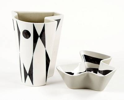 Det här är en vas och en skål av Carl Harry Stålhane för Rörstrand. Mönstret är schysst geometriskt. Vasen är 20 cm hög. Sådana här geometriska grafiska mönster tilltalar mig. Utropet är 2000 kr (Stockholms Auktionsverk 8-9 sep).