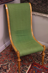 Det här är en ”halvemma” från 1800-talet och träslaget är björk. Jag är inte så lättflörtad vad gäller äldre möbler men den här stolen/fåtöljen känns avskalad och ren. Med ett annat tyg så skulle den nog kunna få en framskjuten plats på mitt landställe. Den ropas ut för 400 kr (Vätterbygdens Auktionskammare 9 sep).