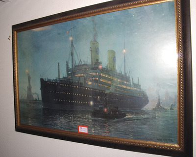 Den här tavlan skulle jag gärna ha. Det är ett tryck med Fartyget Kungsholm som gick mellan Sverige och Amerika. Här ses båten i New York. Kungsholm hade en svenskdesignad inredning i art deco. Superhäftig. Art deco tilltalade ju amerikaner. Tavlan är ganska stor 62×97 cm och utropet är endast 300 kr (Björnssons Auktionskammare 20 sep).