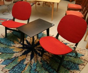 Cool inredning från tidigt 1950-tal. Det svartlackerade bordet är etikettmärkt NK. Fåtöljerna och bordet ropas ut för 1200 kr. Den coola mattan ropas troligtvis också ut men jag hittar den inte i katalogen. (Effecta Auktionsbyrå 21 sep).