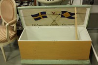 En sjömanskista har platt lock och passar därför bra som soffbord på landet. Denna har i och för sig snygg målning invändigt och kan stå någonstans med öppet lock. Den ropas ut för 1000 kr ( Sikö Auktioner 23-24 sep).
