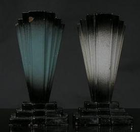 Vilken dramatisk bild. Två vaser i art deco från 1930-talet. De är i emaljerat stål och är tillverkade i Huskvarna. Jag tycker formen är jättefin fast de verkar ju lite trasiga. Utrop 2000 kr, högsta bud just nu 500 kr (Lauritz.com 9 okt).