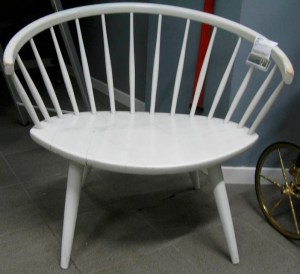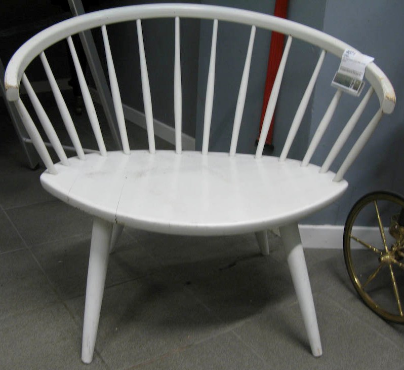 Yngve Ekström (mest känd för fåtöljen Lamino) formgav 1955 stolen Arka. Den har återupptagits i tillverkning igen av Stolab (en ny kostar drygt 4000 kr). Här är ett äldre, lite slitet exemplar. Antingen behåller man den som den är eller så renoverar man den. Jag skulle måla den svart och kanske ha den på den fina 1950-tals mattan till höger. Utropen är 900 kr respektive 100 kr ( Auktionshuset Metropol 13 okt).