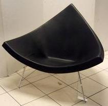 Den här fåtöljen i svart läder ser ut som en bit kokosnöt. Den heter förstås ”Coconut” och är designad av George Nelson för Vitra 1955. Den är fortfarande i produktion. George Nelson skulle ha fyllt 100 år i år. Utropet är 8000 kr (Auktionskompaniet Malmö 20 okt).
