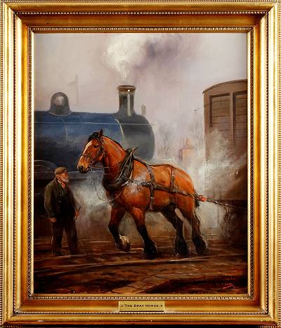 Oljemålningen ”The dray horse” av G.D Giles 1902 är 61X51 cm. Utropet är 10 tkr (Stockholms Auktionsverk 4 nov).
