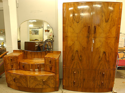 Verkligen maffiga sovrumsmöbler, skåp och byrå. Schysst träslag med trevlig ådring. Särskilt byrån är ju väldigt cool. Utropet är 2000 kr.
