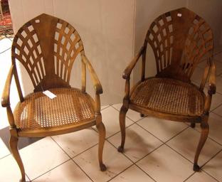 De här stolarna med flätad rottingsits är från 1920-talet. Jag tycker att de är coola och ovanliga. Fast benen är lite trista. Men priset är bra. Fyra stycken ropas ut för 2000 kr.