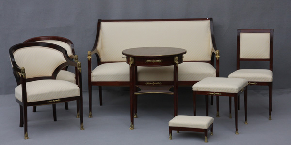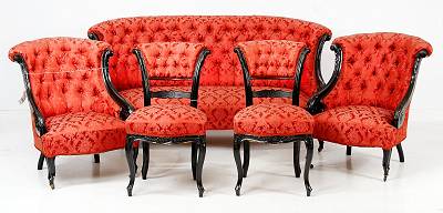 En hel soffgrupp från slutet av 1800-talet i nyrokoko kanske kan vara nåt? Det är ju häftiga färger måste jag säga. Stockholms auktionsverk ropar ut gruppen för 4000 tkr 1-2 december. En annan ball soffgrupp ropar Vätterbygdens Auktionskammare ut den 30 november för 6000 kt. Det möblemanget är mer stilrent och är i empirstil från början av 1900-talet.