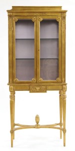 Det här vitrinskåpet är väl ganska ok. Jag är verkligen inte den som gillar vitrinskåp men behöver man ett så är detta det man ska köpa! Det är i Louis seizestil från förra sekelskiftet. Det är förgyllt och bronserat med dekor av bl a fleuroner. Häftigt va?! Höjd 162 cm. Utrop 4000-6000 kr.