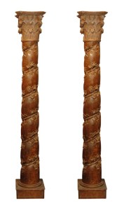 Brevid ett par kolonner, också från förra sekelskiftet, med skuren dekor av frukter och bladverk samt korintiska kapitäl. Höjd 250 cm. Tänk vad de kan göra sig bra på rätt ställe! Utrop 15-18 tkr. Allt från Norrköpings Auktionsverk 6 januari.