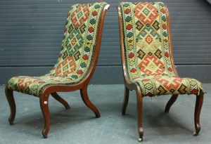 Två svanstolar i rustikt tyg passar bra till ski lodgen. Utrop 1000 kr. Auktionen avslutas 18 januari (Sikö Auktioner).