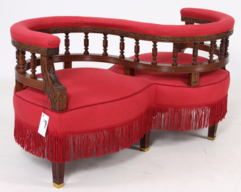 Har man en fästmanssoffa hemma så är det beviset på att man har gott om utrymme. En sådan här pjäs måste ju stå mitt på golvet för att den ska kunna användas ordentligt. Tänk att ha så spasiöst hemma att man kunde hålla ”salong” med en massa intressanta människor. Den här soffmodellen är ju dock gjord för förtroliga samtal.