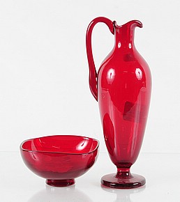 Den röda kannan och skålen i design av Monica Bratt från Reijmyre är väl härliga. Vad kan bli juligare är det? Bud just nu 200 kr (10 nov).