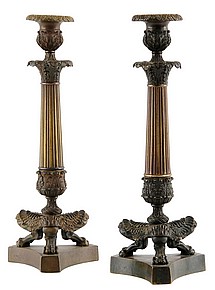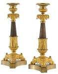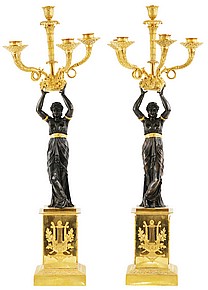 9. Brännförgylld och patinerad brons, empire, för 5 ljus vardera, 70 cm, utrop 80-90 tkr!