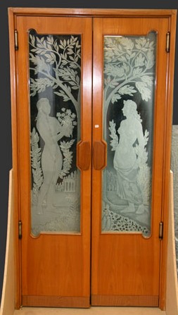 3. Det här blir pricken över i. Ett par svängdörrar av Nils Landberg, Orrefors. Stommen och karmen är  i valnöt. Speglar i klarglas med etsad dekor av nakna kvinnor i antikiserande landskap. Dörren både beställdes och formgavs av Nils Landberg 1959. Höjd 205 cm, bredd 107 cm. Utrop 30 tkr.