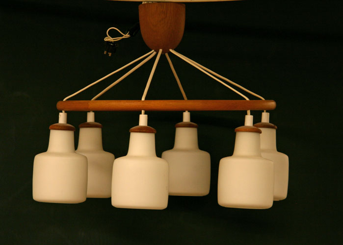 4. Slutligen en takarmatur från 1950-talet med stomme i teak. Behängd med sex lampkupor i vitt glas. Sannolikt dansk design. Utrop 1200 kr.