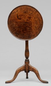 Det första bordet är ett fällbord från 1700-talets andra hälft. Signerat av Jacob Siölin, verksam som snickarmästare i Köping och Kungsör 1767-1785 samt med Köpings hallstämpel. Skivan som har en diameter på 44 cm är fanerad med alrot och pelarfoten är ådringsmålad. Total höjd 70 cm. Utrop 8-10 tkr. Jag köper gärna något liknande bara priset minst har en nolla färre.