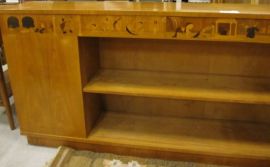 2. Ännu en snygg svensk möbel. En bokhylla i alm med intarsia i Tusen och en natt-mönster. Nu är den användbar som platt-TV-bänk, eller hur?!!! Höjdmåttet är ej angivet men den är 198 cm lång. Den är av Erik Mattsson och Sven Ekholm för Mjölby Intarsia. Sådana här låga hyllor brukar vara billiga.