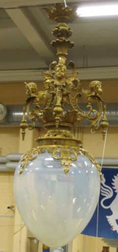 5. Taklampa i förgylld brons med opaliscerande glaskupa. Den är oscariansk från 1800-talets slut och den är 65 cm hög. Den är väl fin?!!! Nu tänker jag på landet igen!