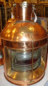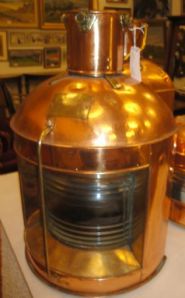 3 och 4. Lanternor (styrbord o babord) i koppar och mässing. Från 1900-talets första hälft och tillverkade i Japan. De är 59 cm höga, dvs rejäla. Nu tänker jag på landstället där de skulle passa fint. Synd bara att de har delat upp det i två poster. Tänk om man får bara den ena!