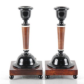 Nästa julklappsförslag är dessa ljusstakar i trä med svärtad dekor, beninläggningar och kulfötter från 1800 -talet. Mycket stiliga! Höjden är 19 cm och utrop 800 kr.
