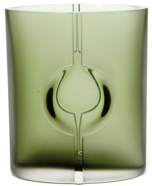 Vasen är i gråtonat glas (ser grönt ut på bilden) och signerad Tapio Wirkkala. Höjden är 18 cm och tyvärr har den en smärre nagg. Utropet är 1000 kr på Stockholms stadsauktion 10-11 januari.