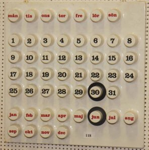 En stilren datumtavla i plast från Turino, Italien. Dock tillverkad för svenska marknaden. Beskrivs som defekt.Snygg ändå. Inget utropspris angivet.