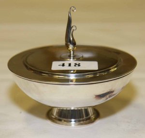 Kolla den här silverdosan då. Jättesnygg! Man kan ha hemliga saker i den. Måtten är förstås inte angivna men den väger 191 gram. I katalogen står: T Eldh, K & EC 1946. Det säger inte mig mycket eftersom jag inte kan nåt om silver. Jag har bara kommit på att det är snyggt. Jobbigt att putsa bara, men det får man ta. Utrop 400 kr.