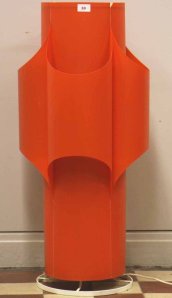 Eller en golvlampa i orange plast av Hans Agne Jacobsen för Markaryd. Höjdmåttet finns inte angivet men jag tror visst att lampan kan göra sig bra på ett lågt bord också. Utropspris 500 kr.